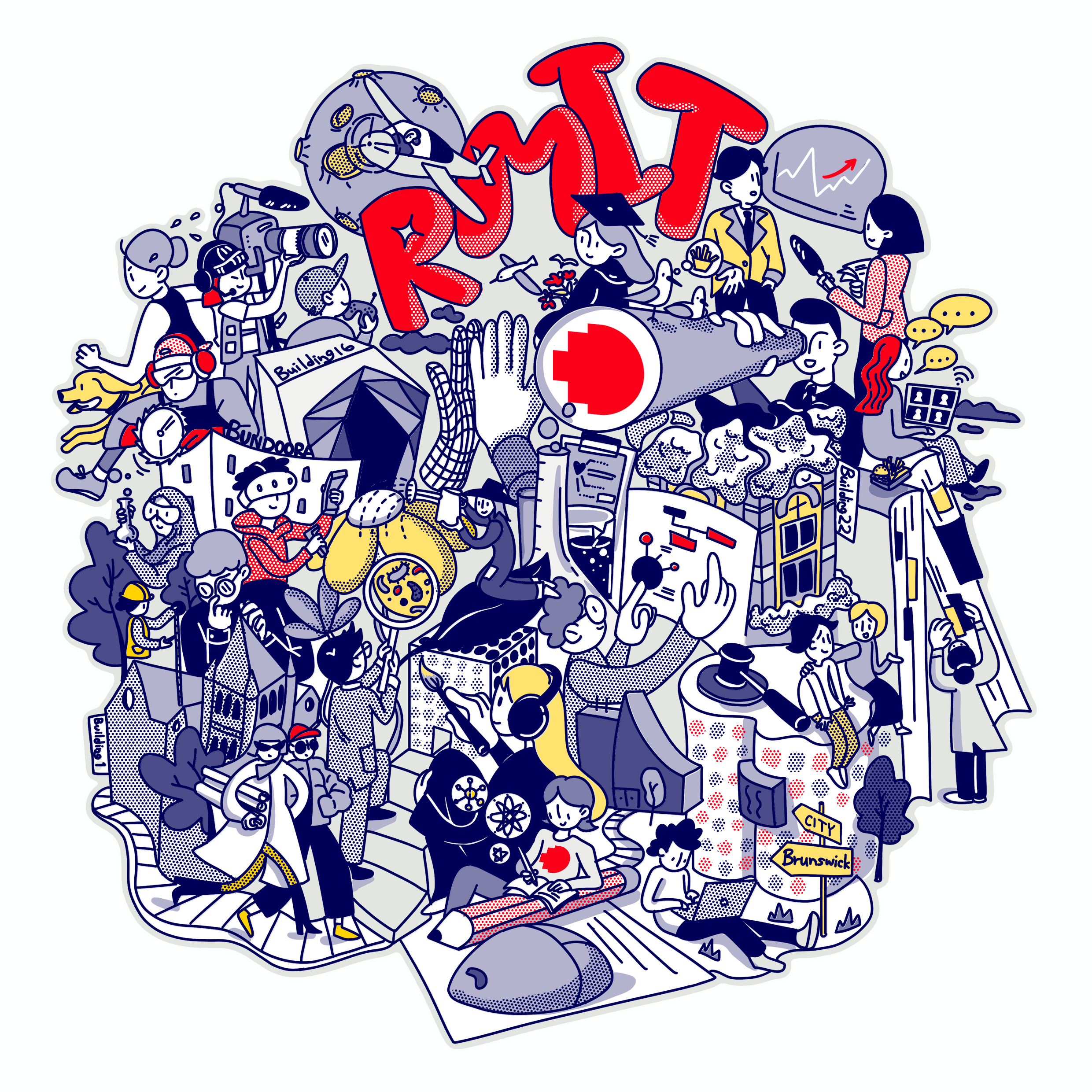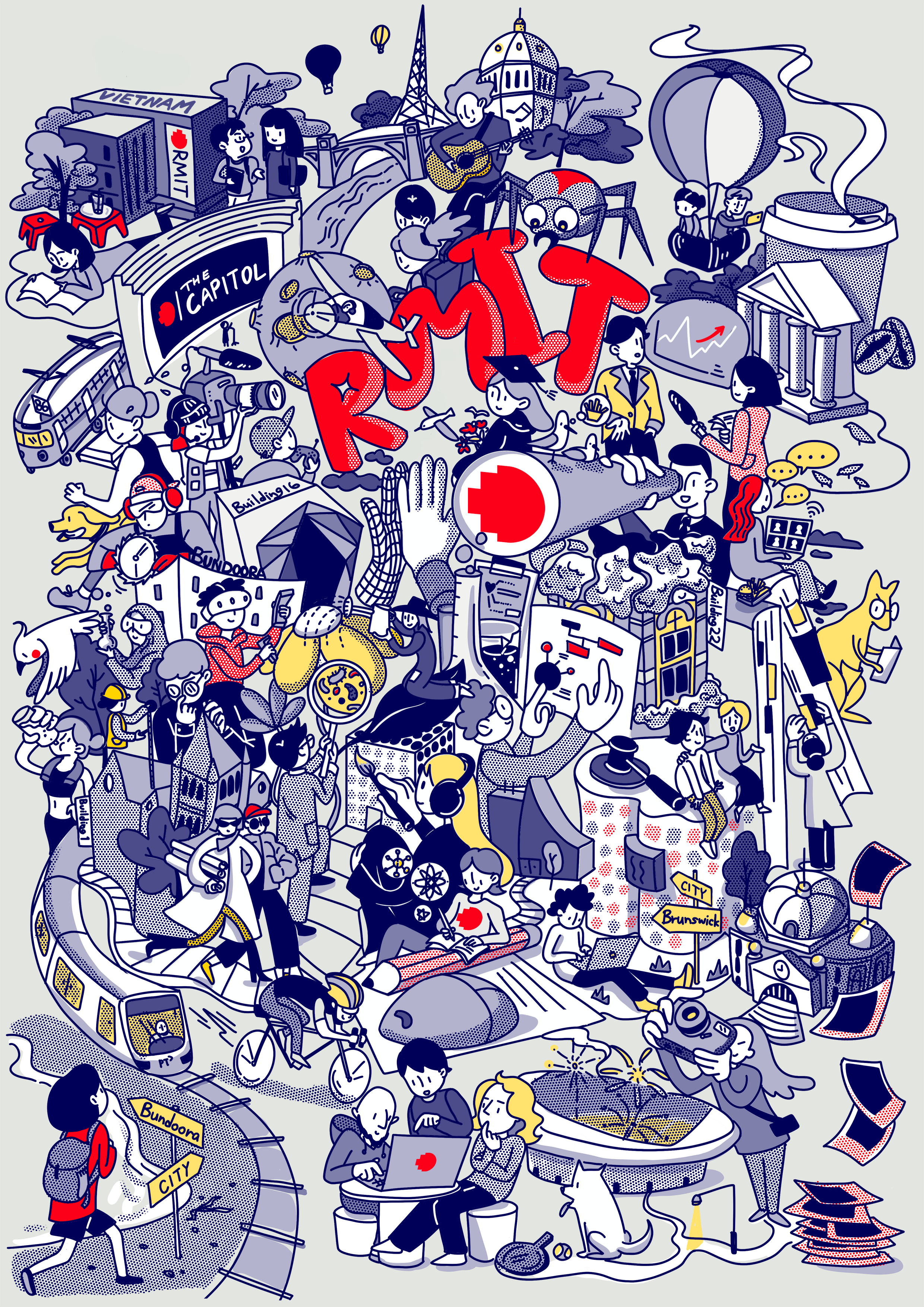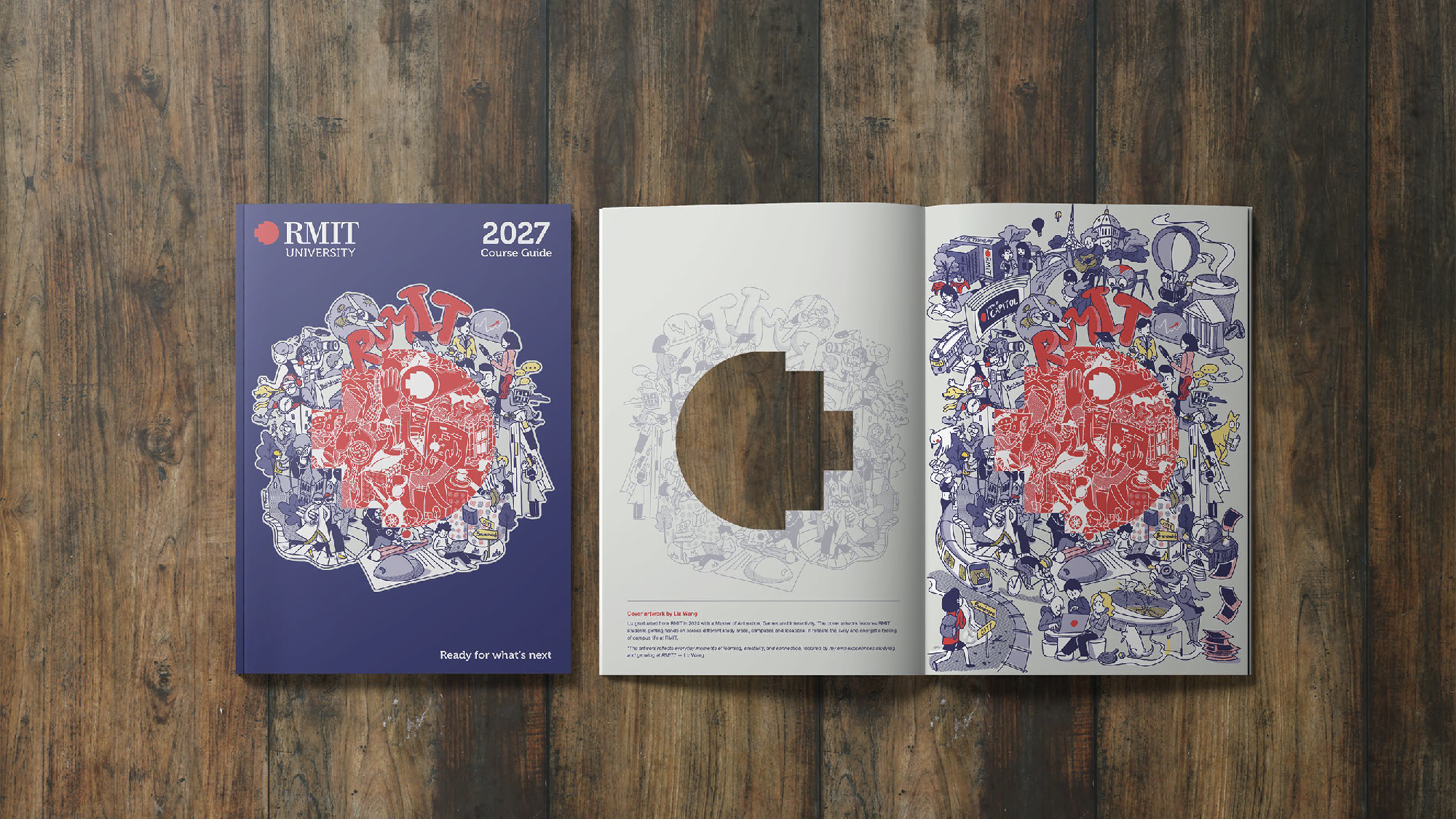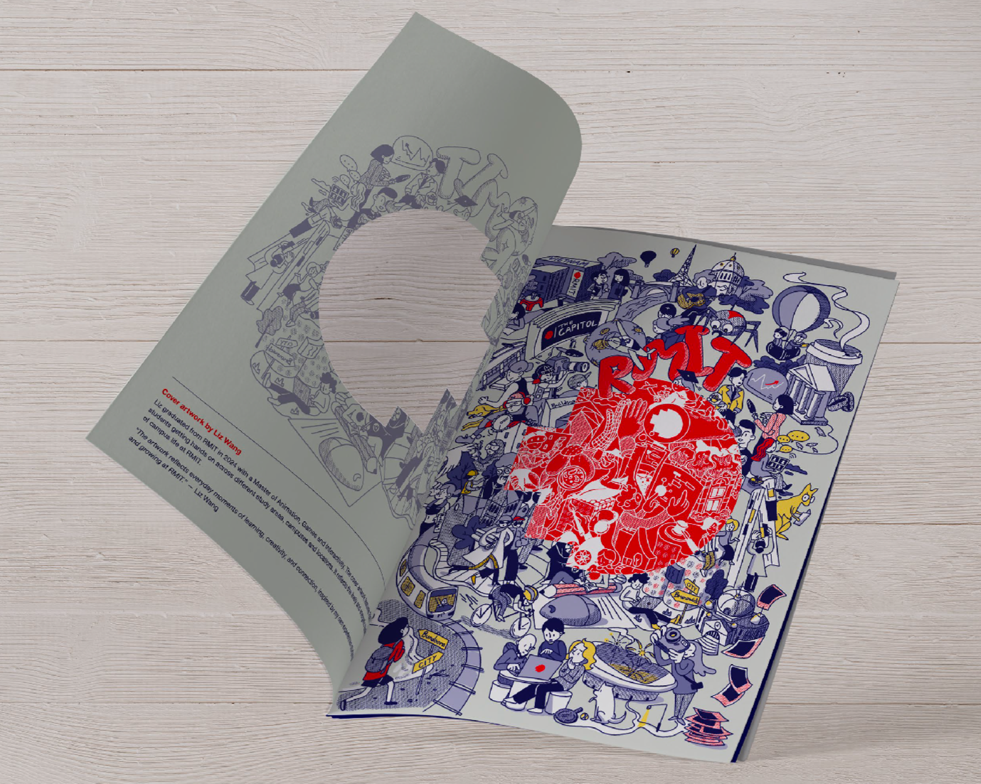 Liz graduated from RMIT in 2024 with a Master of Animation, Games and Interactivity. The cover artwork features RMIT students getting hands on across different study areas, campuses and locations. It reflects the lively and energetic feeling of campus life at RMIT.